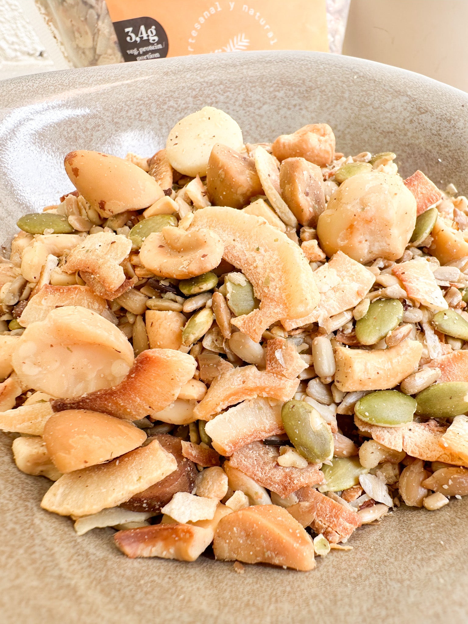 Es perfecto para consumir durante el dia como snack, para consumirlo como sustituto de los cereales tradicionales en el desayuno, como topping para ensaladas, pancakes y waffles.