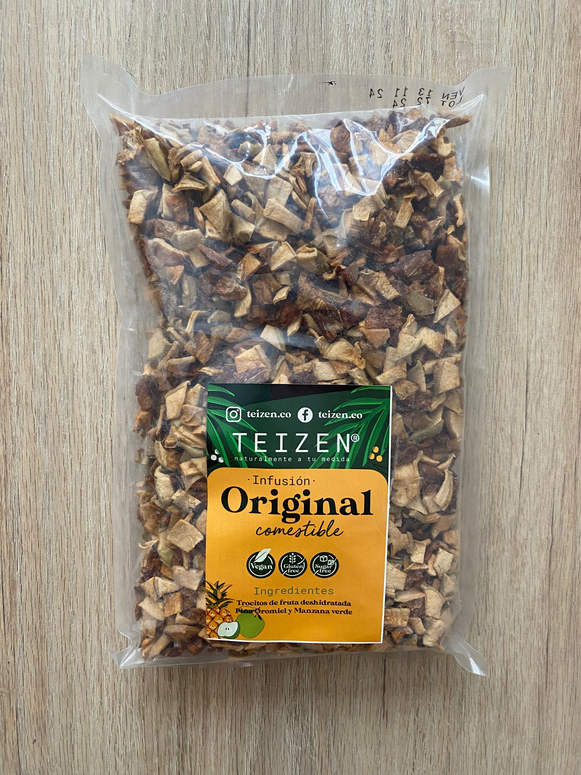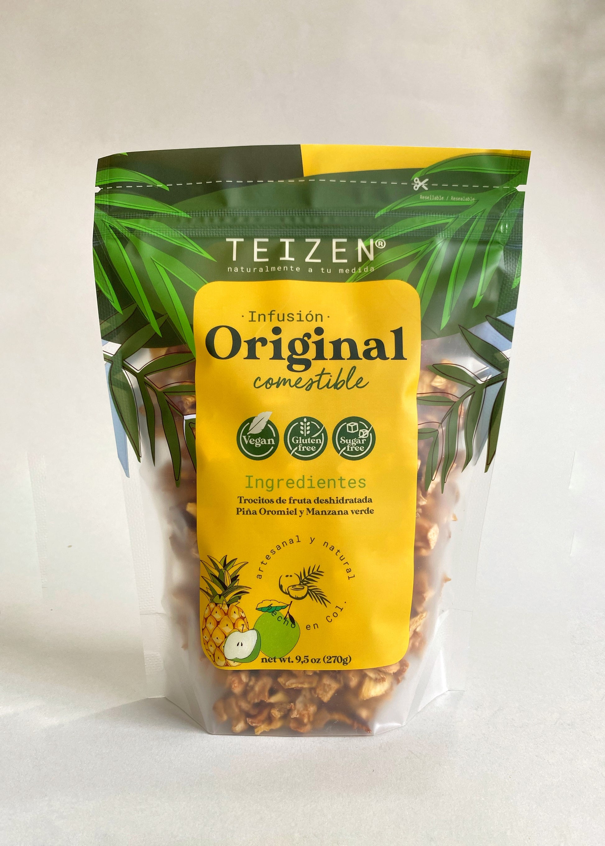 Ingredientes: Trozos deshidratados de Piña Oromiel y Manzana verde.