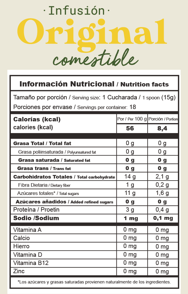 Bebidas calientes: 1 porción (15gr) para un vaso de 8oz. Agregarle agua caliente y dejar reposar por 5 minutos para que la fruta suelte su delicioso sabor Dato importante: Es 100% comestible, así que sírvelo con una cucharita.